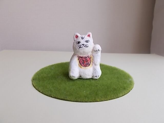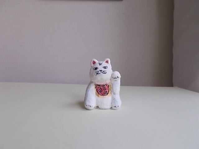 人形オブジェ「招き猫」は、紙粘土で制作をしています。